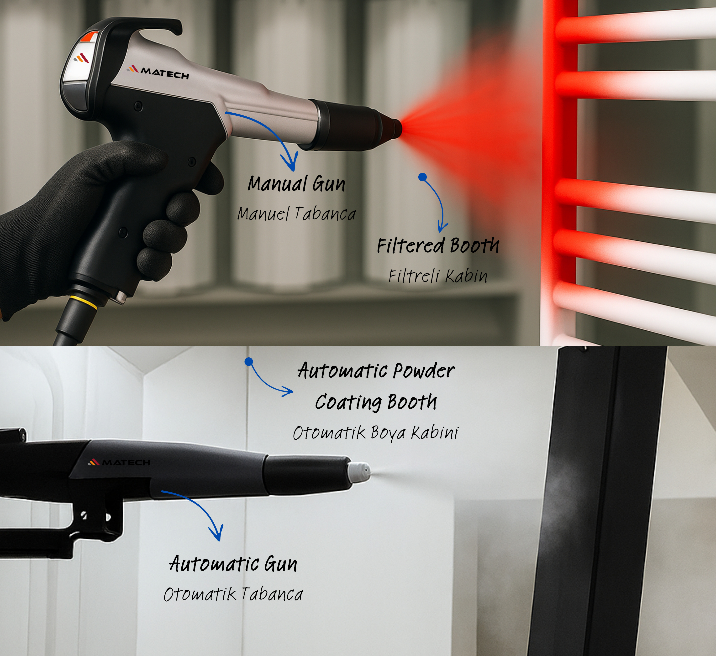 Manuel tabancalar, operatör tarafından kullanılan ve yönlendirilen tabancalardır. Kullanımı kolaydır, bu nedenle özellikle küçük ve orta ölçekli üretimlerde tercih edilir. Parça çeşitliliğinin fazla olduğu, sık sık renk değişimi yapılan veya özel tasarımların boyandığı uygulamalarda manuel tabancalar önemli bir avantaj sağlar. Bu tabancalar sayesinde farklı boyut ve geometrilerdeki parçalar kolayca boyanabilir. Zor ulaşılan alanlar ya da detaylı yüzeyler operatör kontrolüyle rahatlıkla kaplanabilir. Ayrıca yatırım maliyeti düşük olduğu için atölyeler ve esnek üretim yapan işletmeler için ideal bir çözümdür.