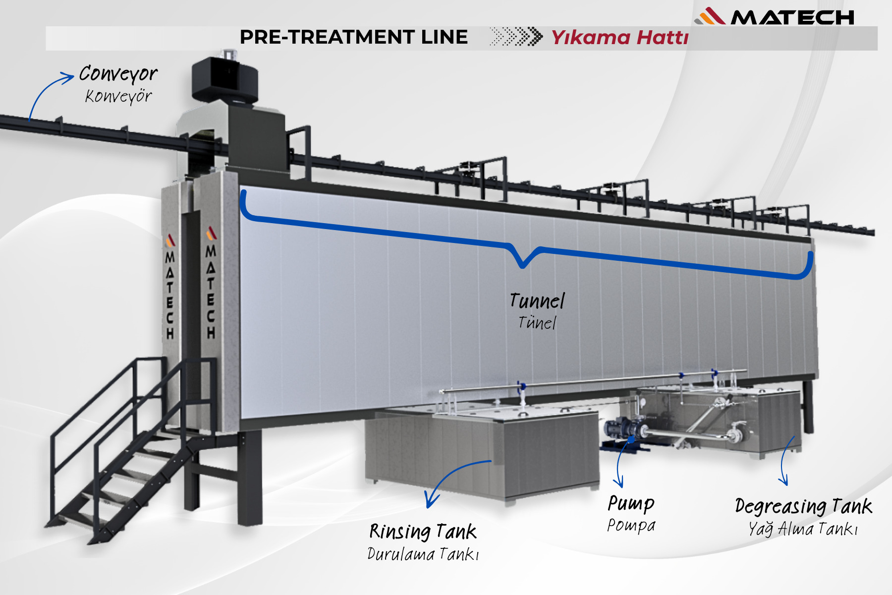 Tünel: Boya öncesi parçaların otomatik olarak taşındığı ve işlem gördüğü kapalı sistemdir. Farklı istasyonlarda yağ alma, durulama ve pasivasyon gibi aşamalar gerçekleşir.