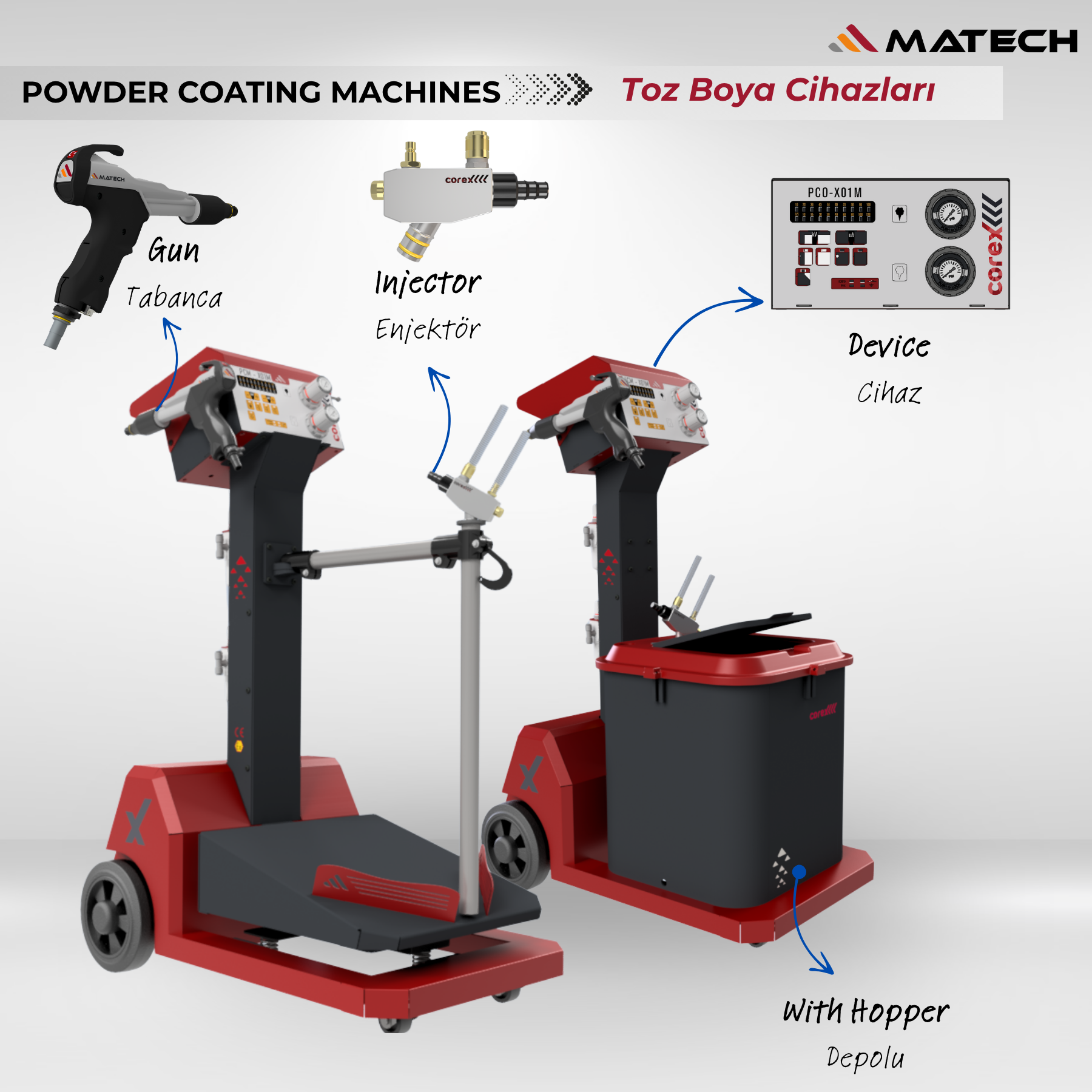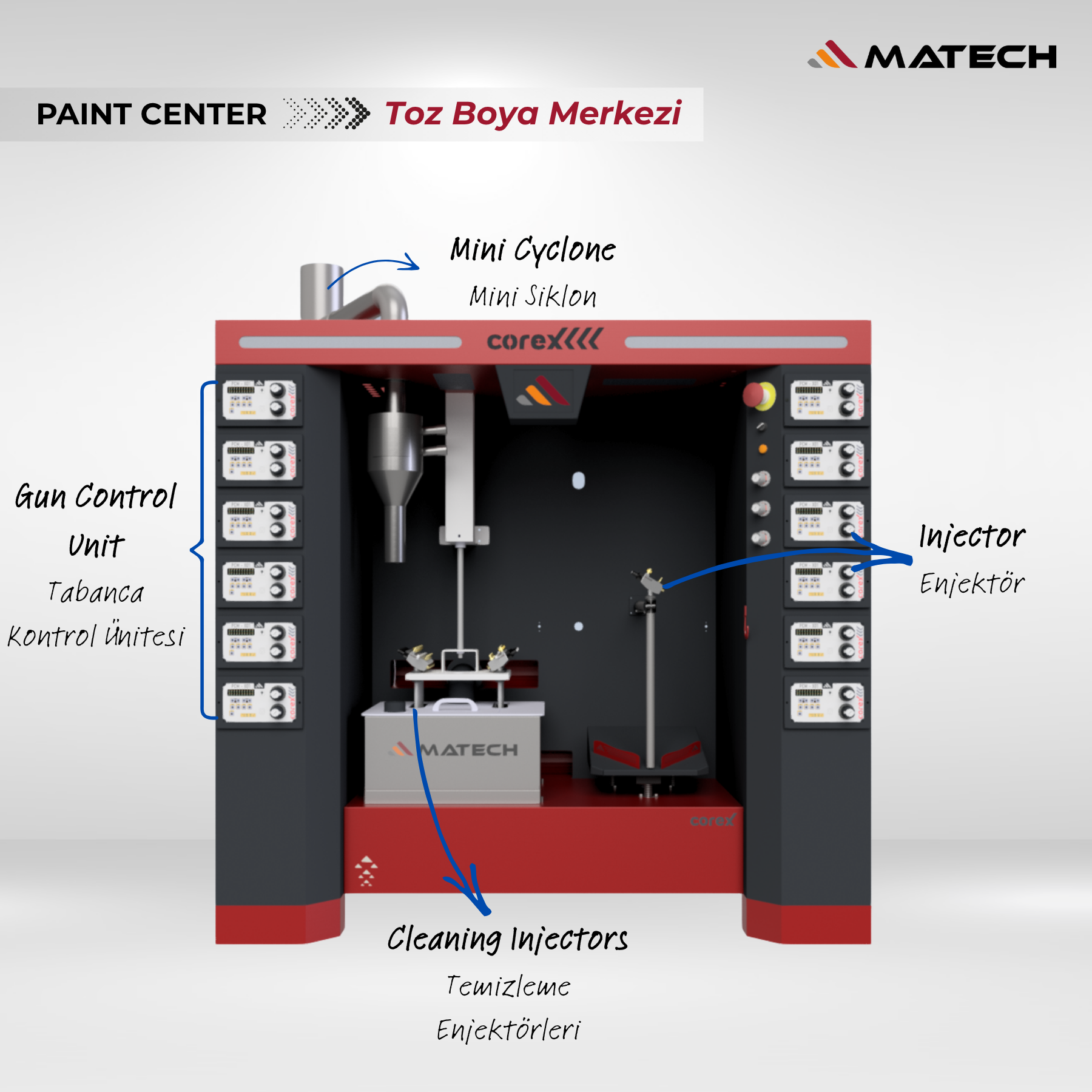 Corex, endüstriyel boyama süreçlerinde yüksek verimlilik ve kusursuz kaplama kalitesi sunan gelişmiş çözümler sunar. Robot sistemleri, tam otomatik tabancalar ve entegre boya merkezleri sayesinde üretim hatlarında maksimum hız ve minimum boya kaybı sağlanır. Depolu ve deposuz cihaz seçenekleri, farklı üretim ihtiyaçlarına göre esnek kullanım avantajı sunarken; Corex otomatik tabancalar hassas atomizasyon ve üstün kaplama performansı ile mükemmel sonuçlar ortaya koyar.